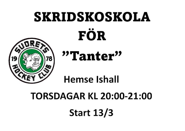 Nu startar Sudrets HC skridskoskola för "tanter". Ingen åldersgräns utan känner man sig som en "tant" i alla fall på isen är man välkommen att vara med och öva på sina skridskoskills under några torsdagar i mars och april. Torsdagen den 13/3 kl 20:00 kör träningen igång under ledning av Johanna Karlsson. Ingen deltagaragift men man skall vara medlem i Sudrets HC. Vill man vara med och ännu inte är medlem så löser vi det när ni kommer.